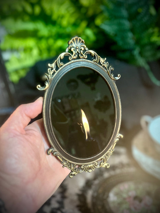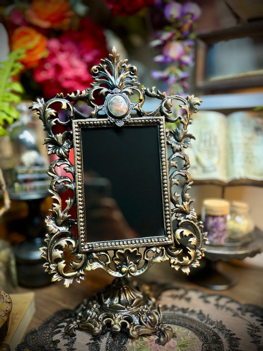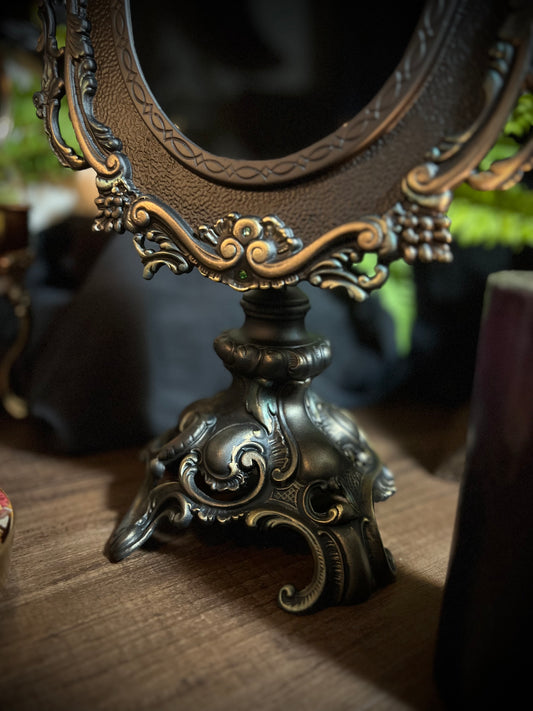 Scarlet Black Glass Scrying Mirror with Easel | Gothic Vintage Cast Metal Frame with Scrolling Details