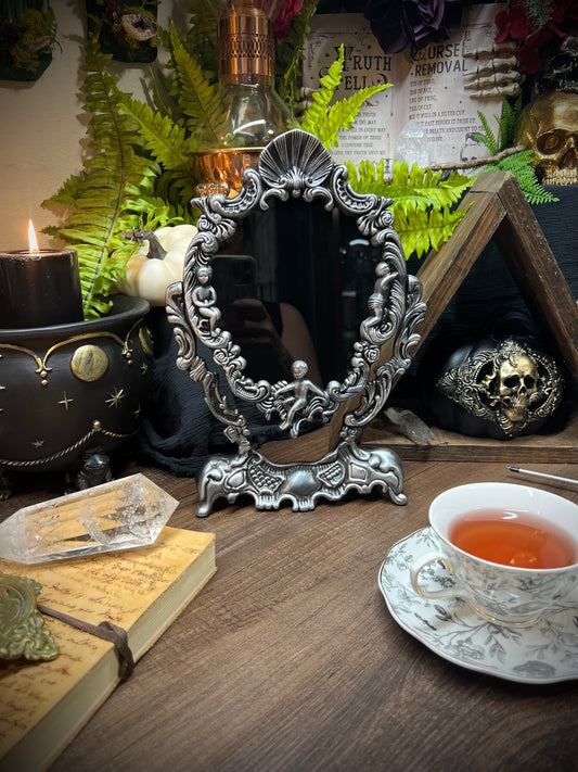 Placed among candlelight and crystals, skulls, old books, and wilting flowers, these mirrors become altars — not to appearance, but to identity. They ask: Who are you beneath the surface? What has time etched into your gaze? And if you listen long enough, perhaps the reflection you find won’t be one of flesh at all — but soul.