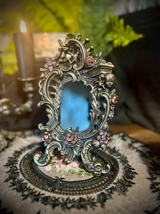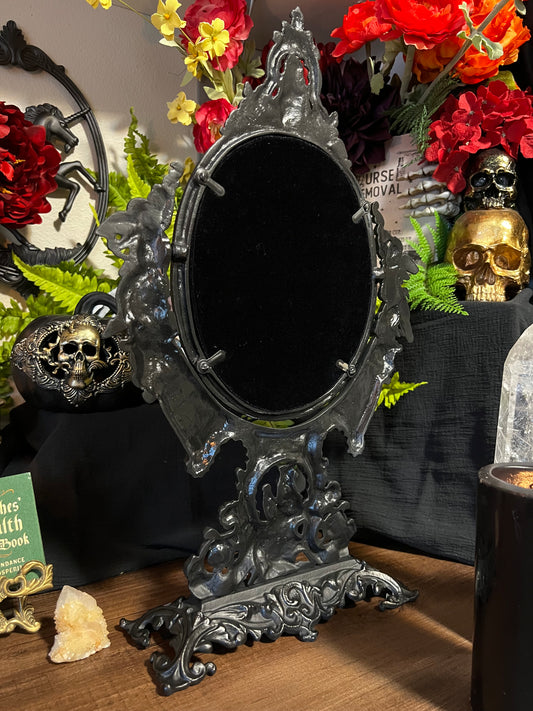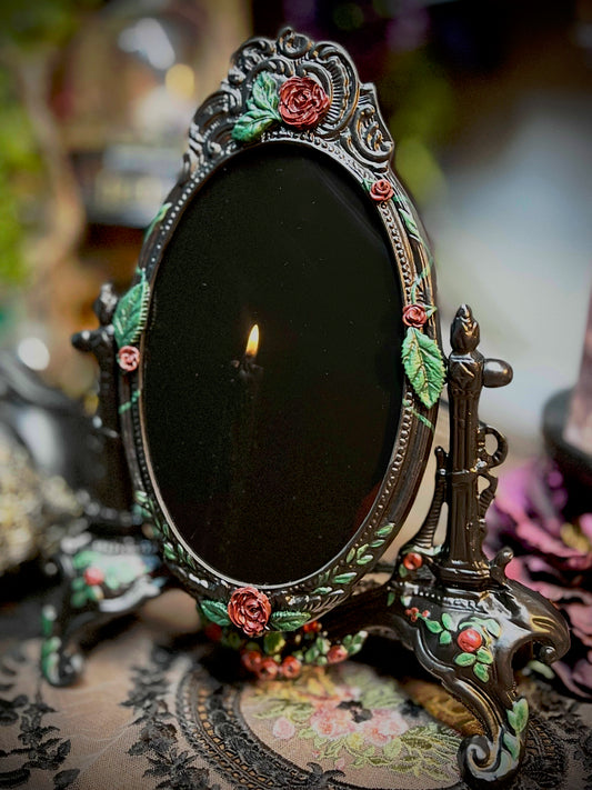 My Immortal Hand Painted Black Glass Tilt Scrying Mirror | Gothic Vintage Cast Metal Frame with Roses