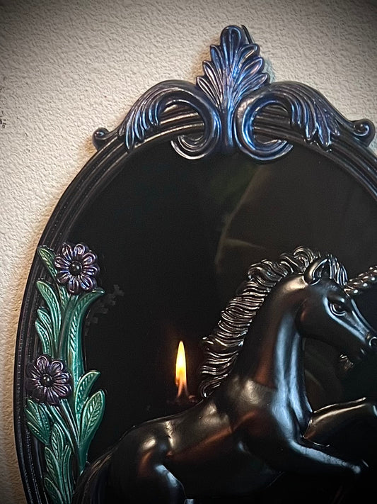 The Last Unicorn Black Glass Scrying Mirror Wall Hanging | Vintage Cast Metal Gothic Frame