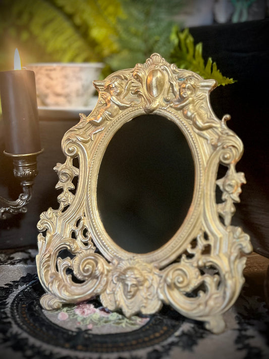 Golden Cherub Black Glass Scrying Mirror | Vintage Ornate Frame with Easel Back for Shadow Work