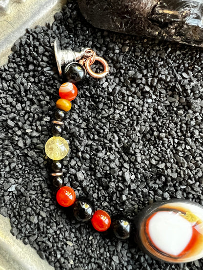 Introducing the Carnelian Bracelet, a truly unique piece that combines the vibrant energy of carnelian, tourmaline, citrine, fire agate, garnet, and obsidian. Each bead is a work of art, radiating luster and shimmer that captivates the eye.