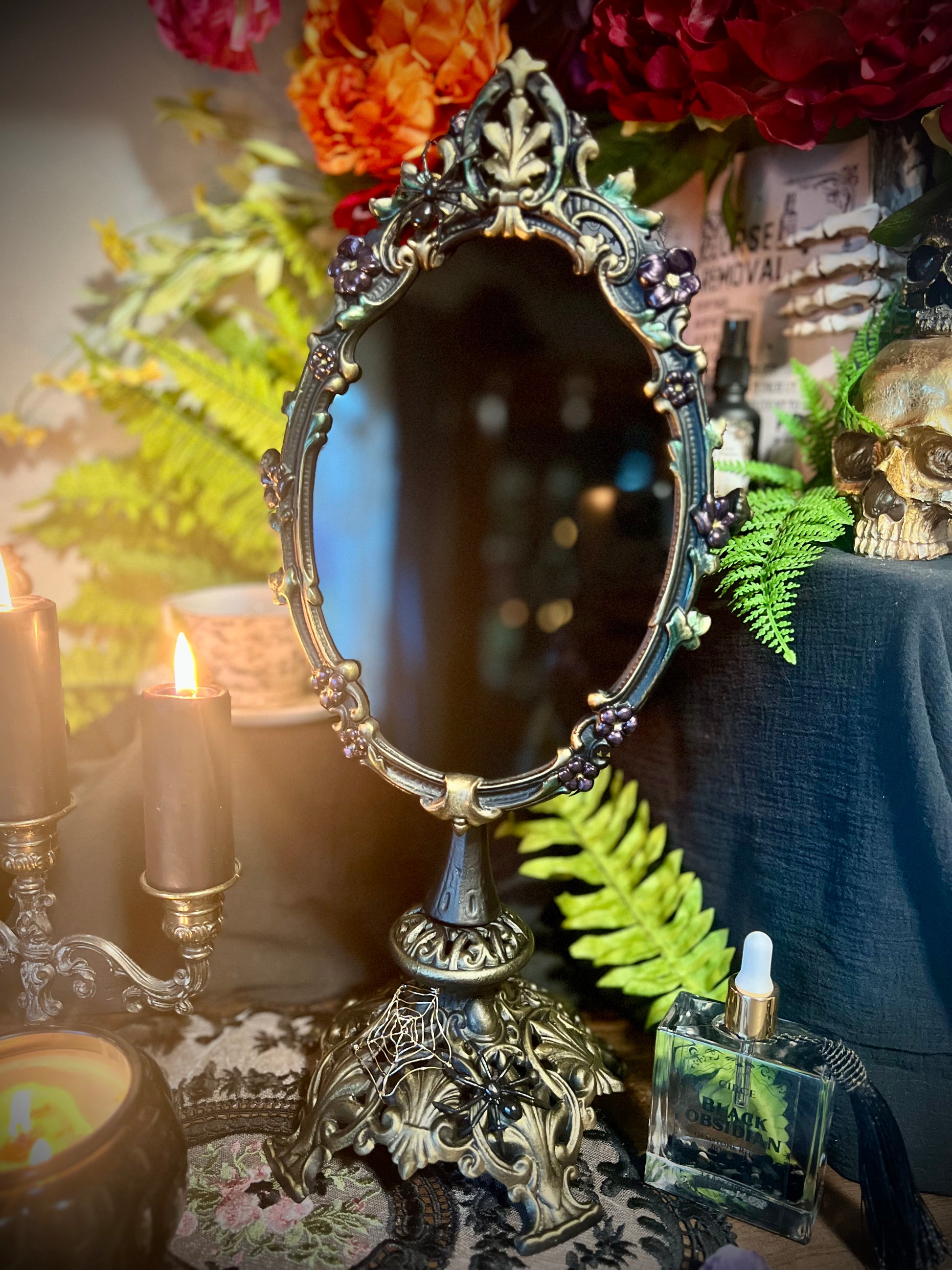 The Charlotte Scrying Mirror is an exquisite creation that bridges beauty and mystery—a vintage-inspired standing mirror reimagined as a talisman of transformation. Its ornate frame, kissed with antique gold and deep green undertones, blooms with sculpted violets that shimmer softly under the light. At the crown, a single handmade spider guards her domain, patiently weaving the unseen threads between realms. Her sister rests at the base, near a delicately hand-beaded web that glistens like morning dew—a symbol of creation, fate, and divine connection.