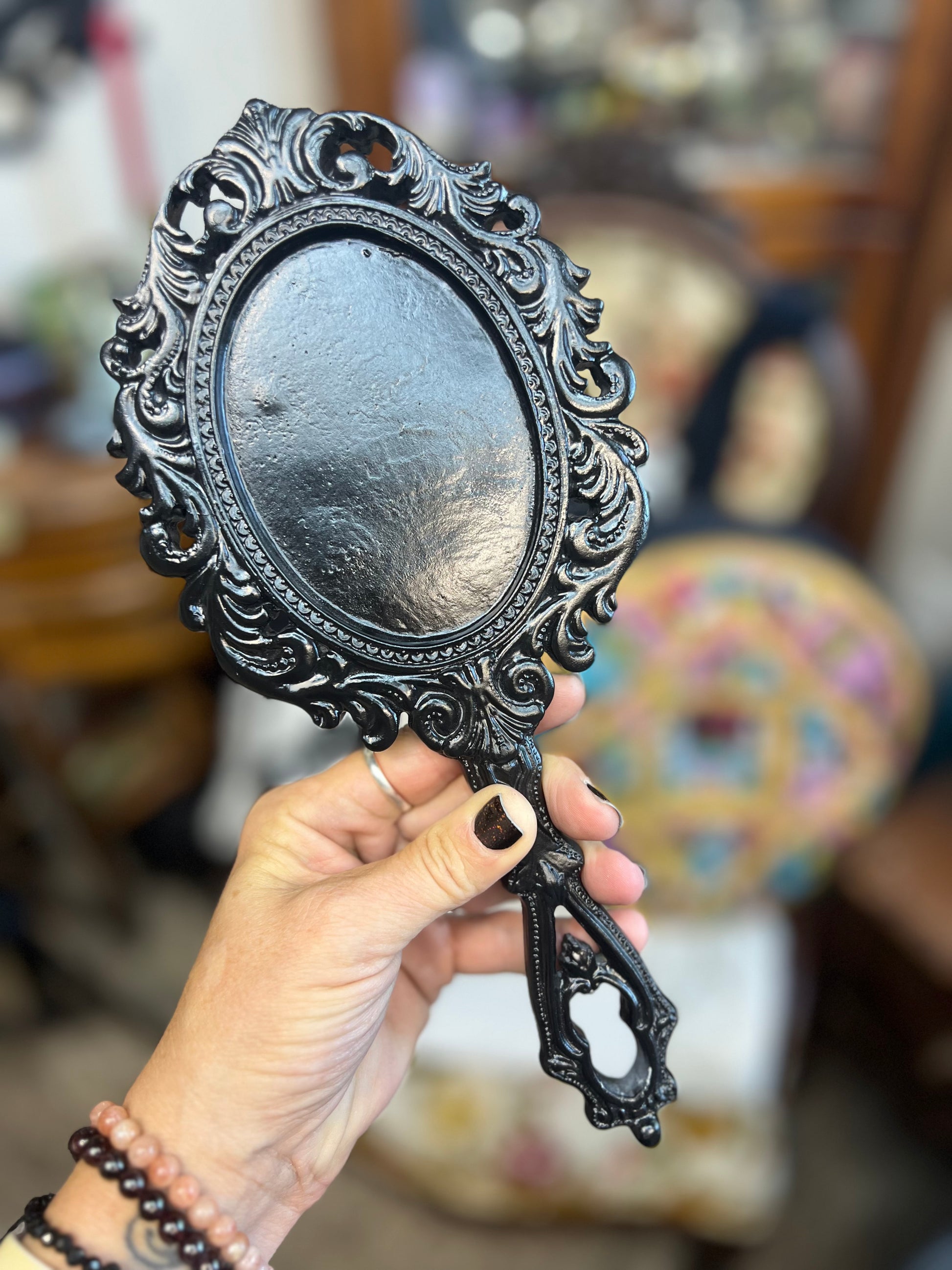 Black handheld mirror with dark fae aesthetic. Lots of black, gray and minimal color in dark shades of green purple and blue. I am envisioning this piece to have a mat/satin finish low gloss except in the areas to enhance color. Glass will be black. (silver mirror is an option for $50, this covers cutting the cutting the template and materials)