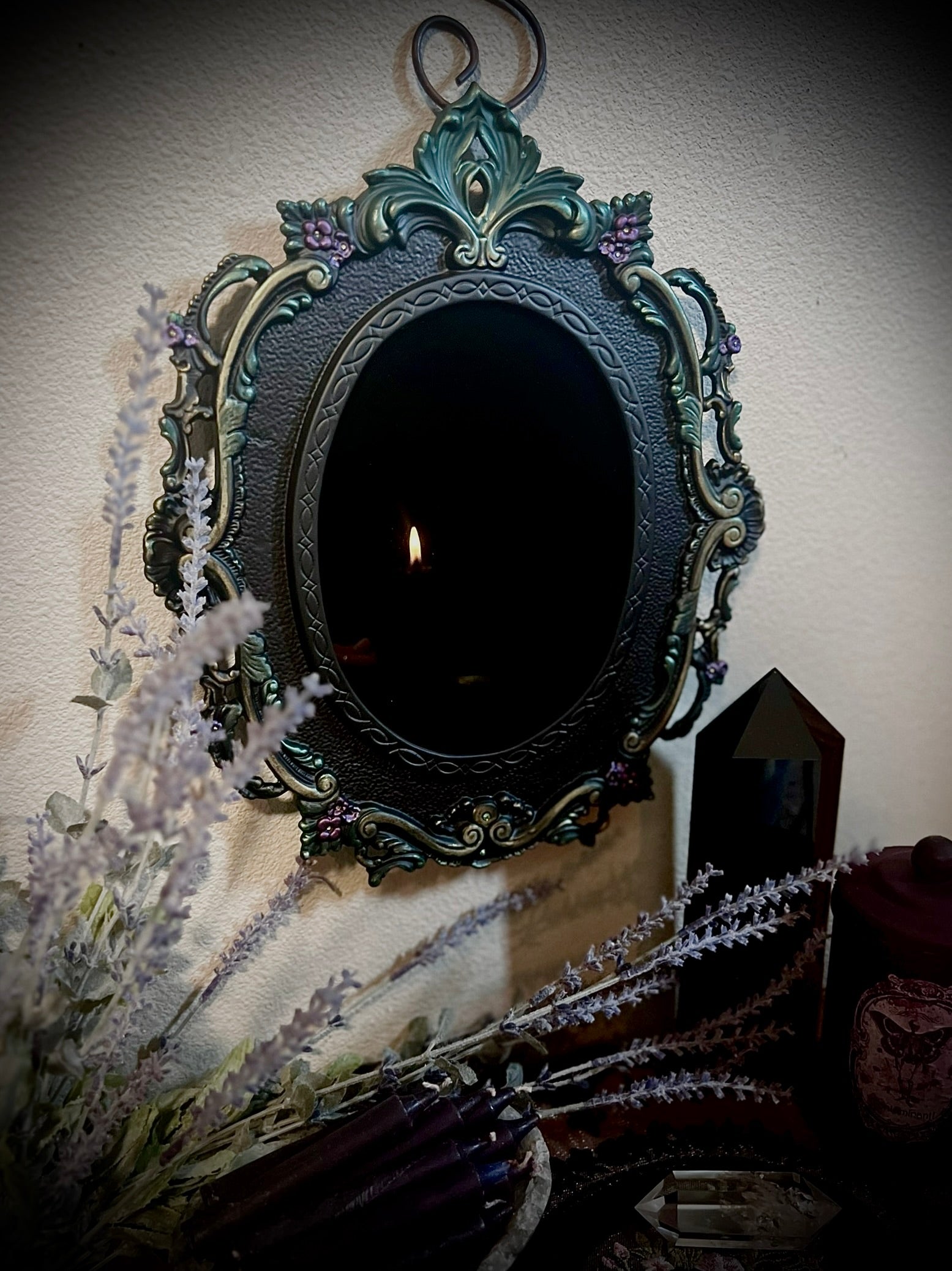 The Forest Queen scrying mirror is crafted with black glass, a vintage cast metal frame, and black velvet backing—an enchanted piece of gothic artistry. This mirror may be displayed as a wall hanging or upon its detailed easel stand, making it both versatile and striking in your sacred space.
